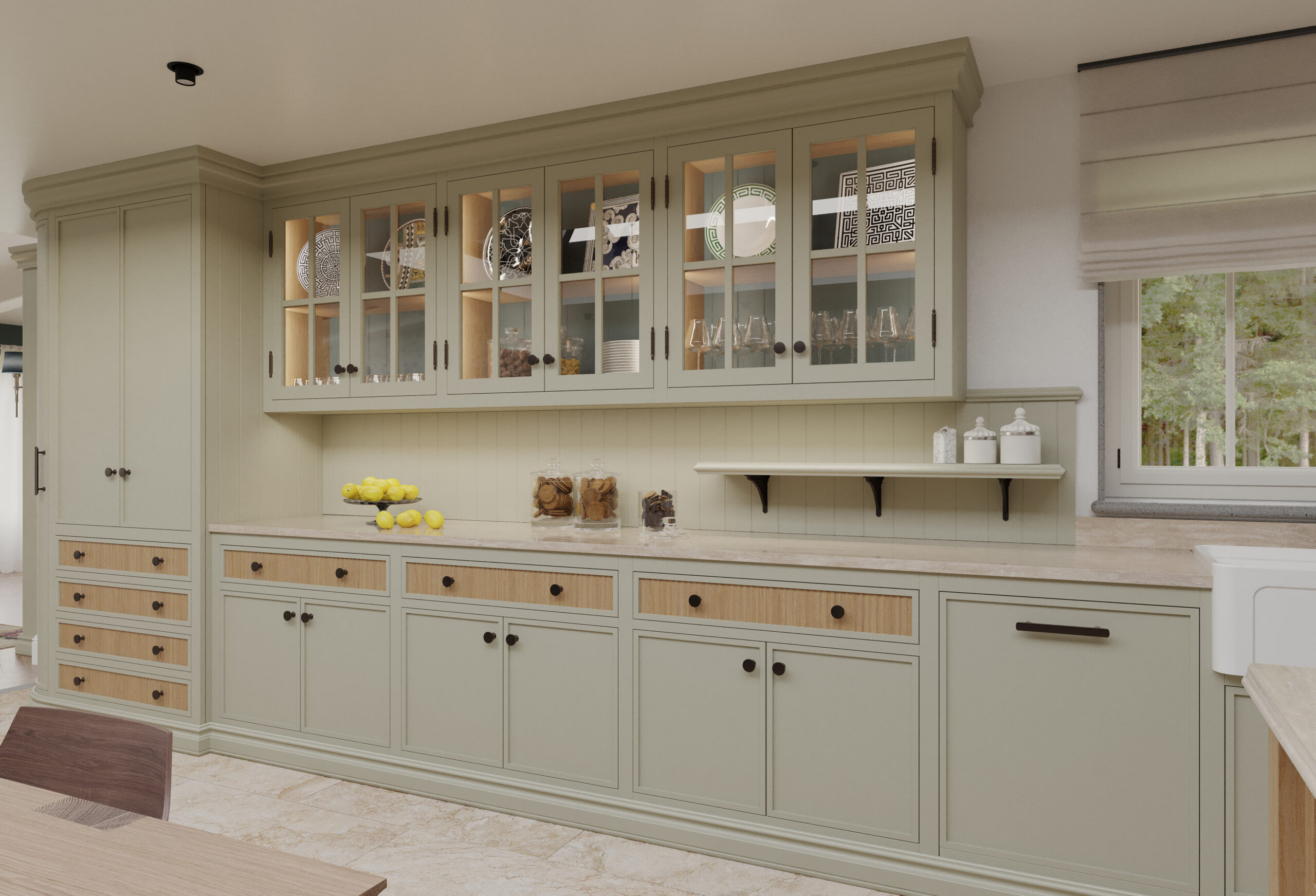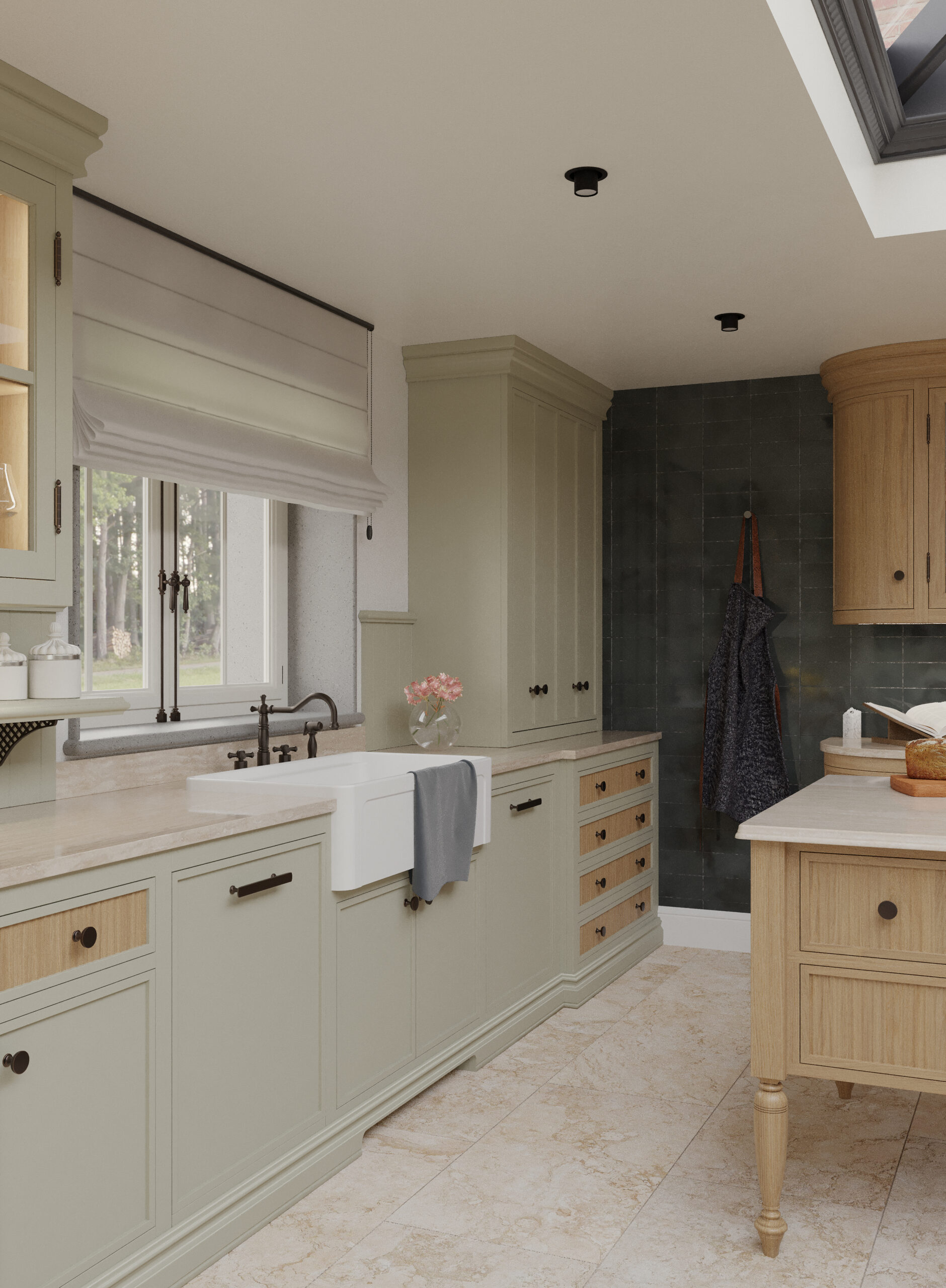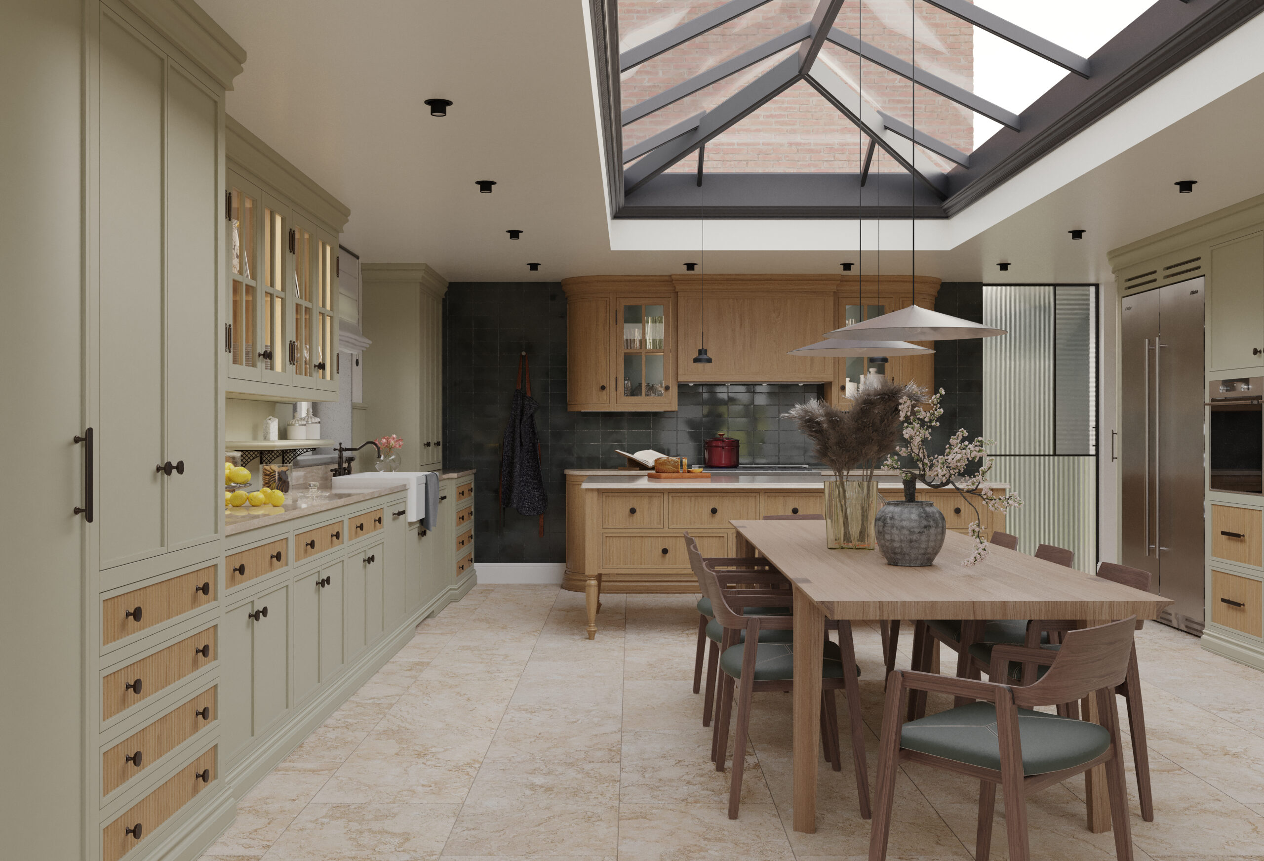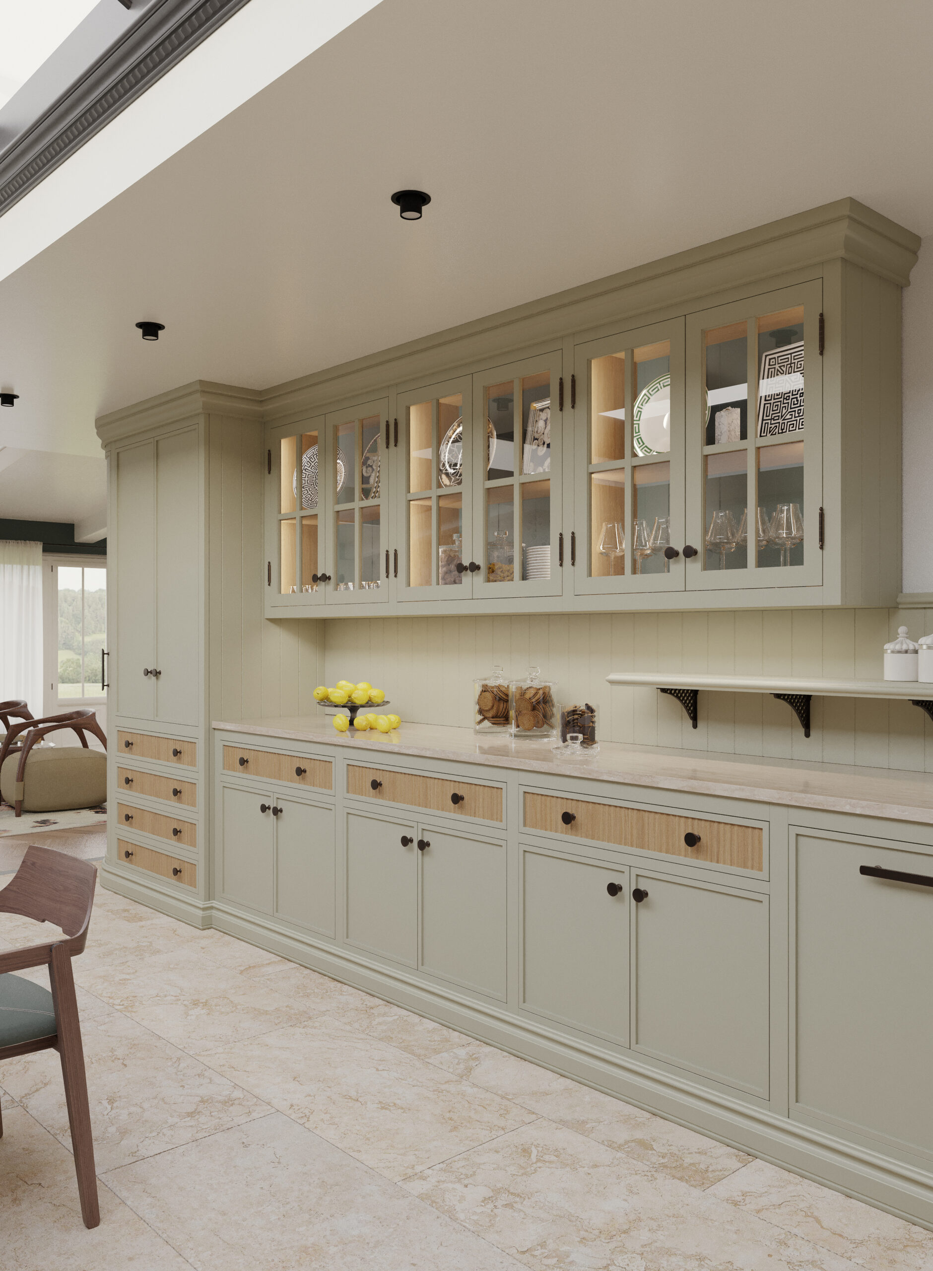Come nella migliore tradizione inglese, lo stile d’arredo è informale, ma iconico. Un continuo rimando ai colori della terra e della natura, ai dettagli di memoria come le cerniere a vista delle vetrine e il lavello in ceramica, che si incontrano piacevolmente con quelli di design dei faretti a soffitto.