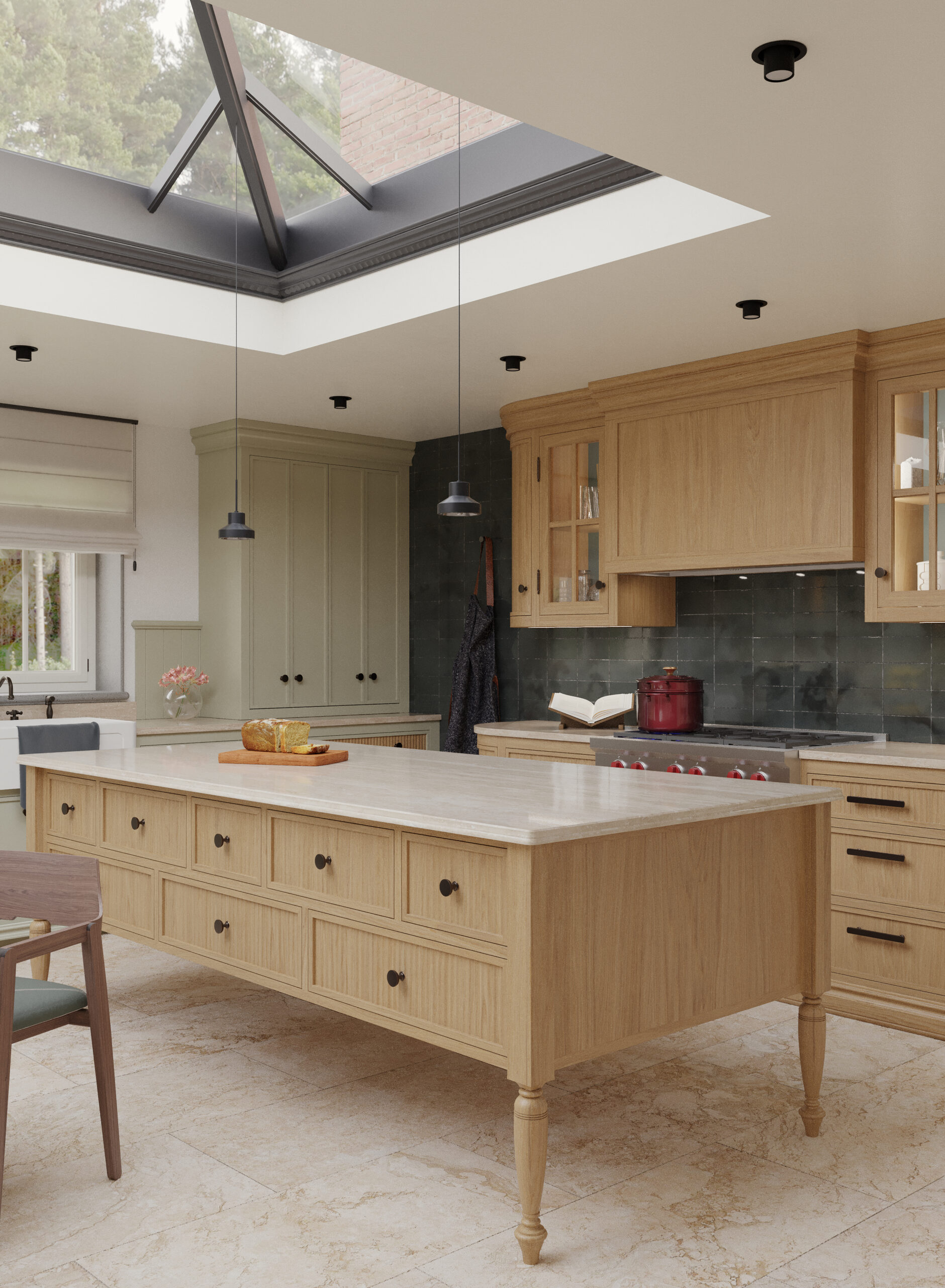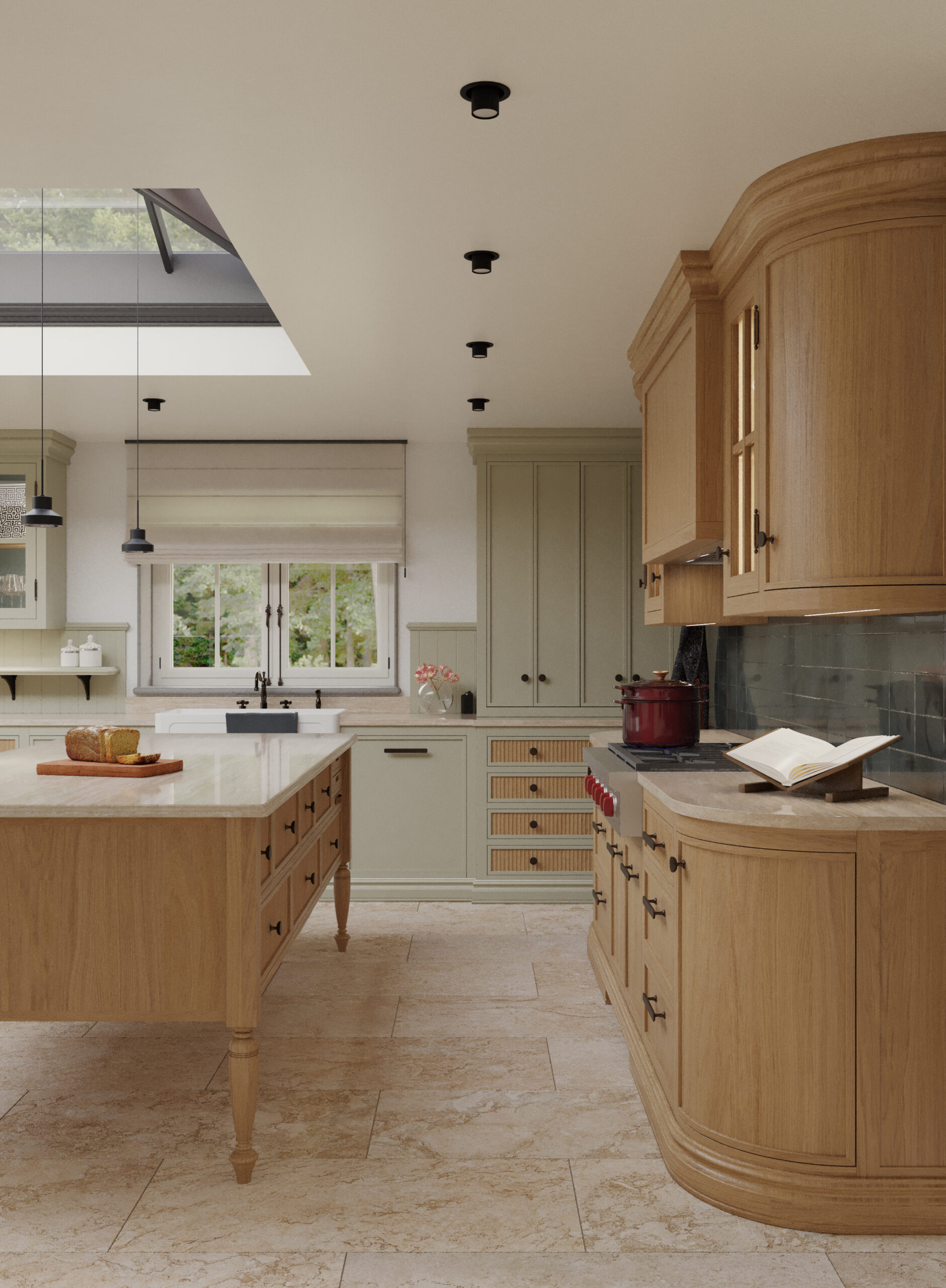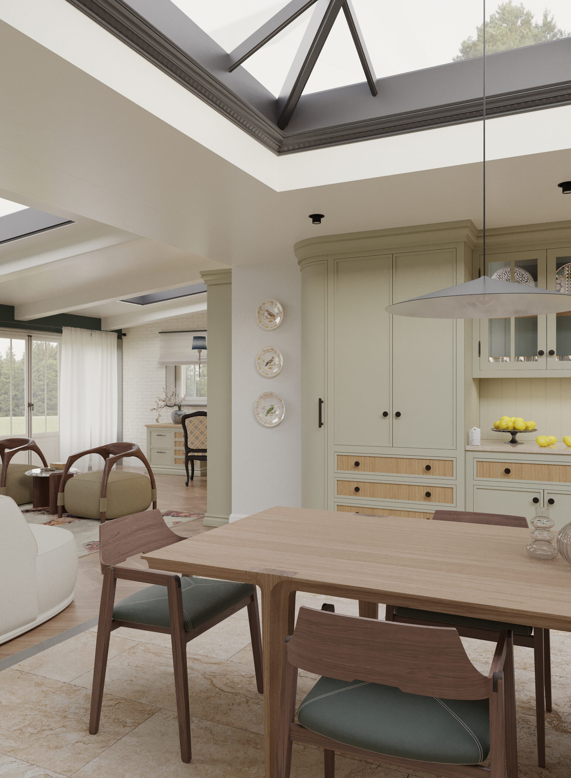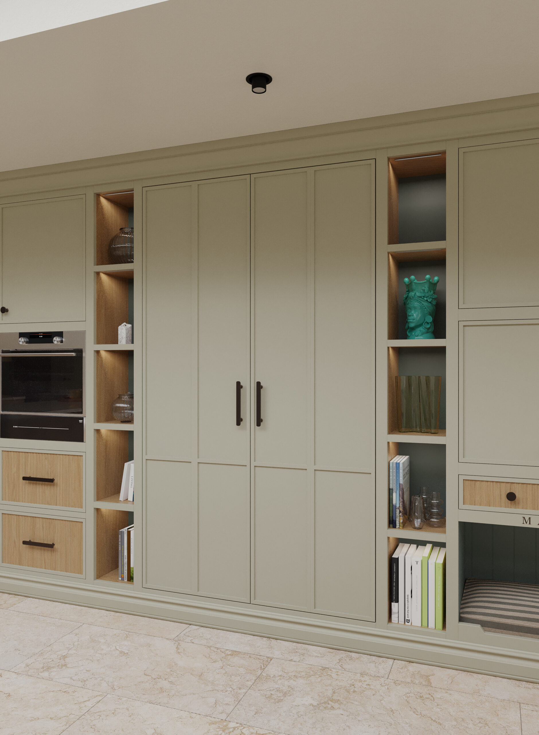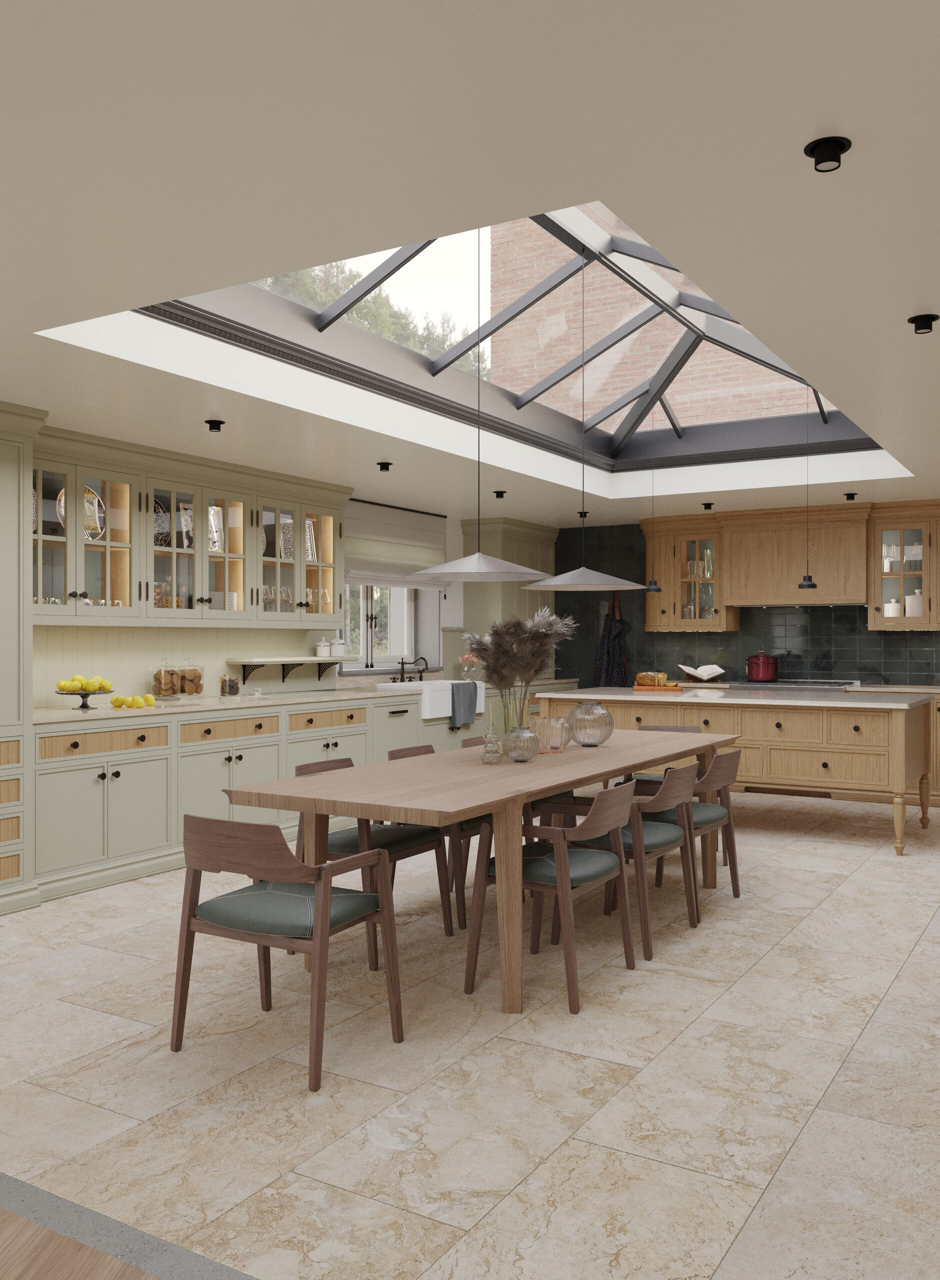 Come nella migliore tradizione inglese, lo stile d’arredo è informale, ma iconico. Un continuo rimando ai colori della terra e della natura, ai dettagli di memoria come le cerniere a vista delle vetrine e il lavello in ceramica, che si incontrano piacevolmente con quelli di design dei faretti a soffitto.