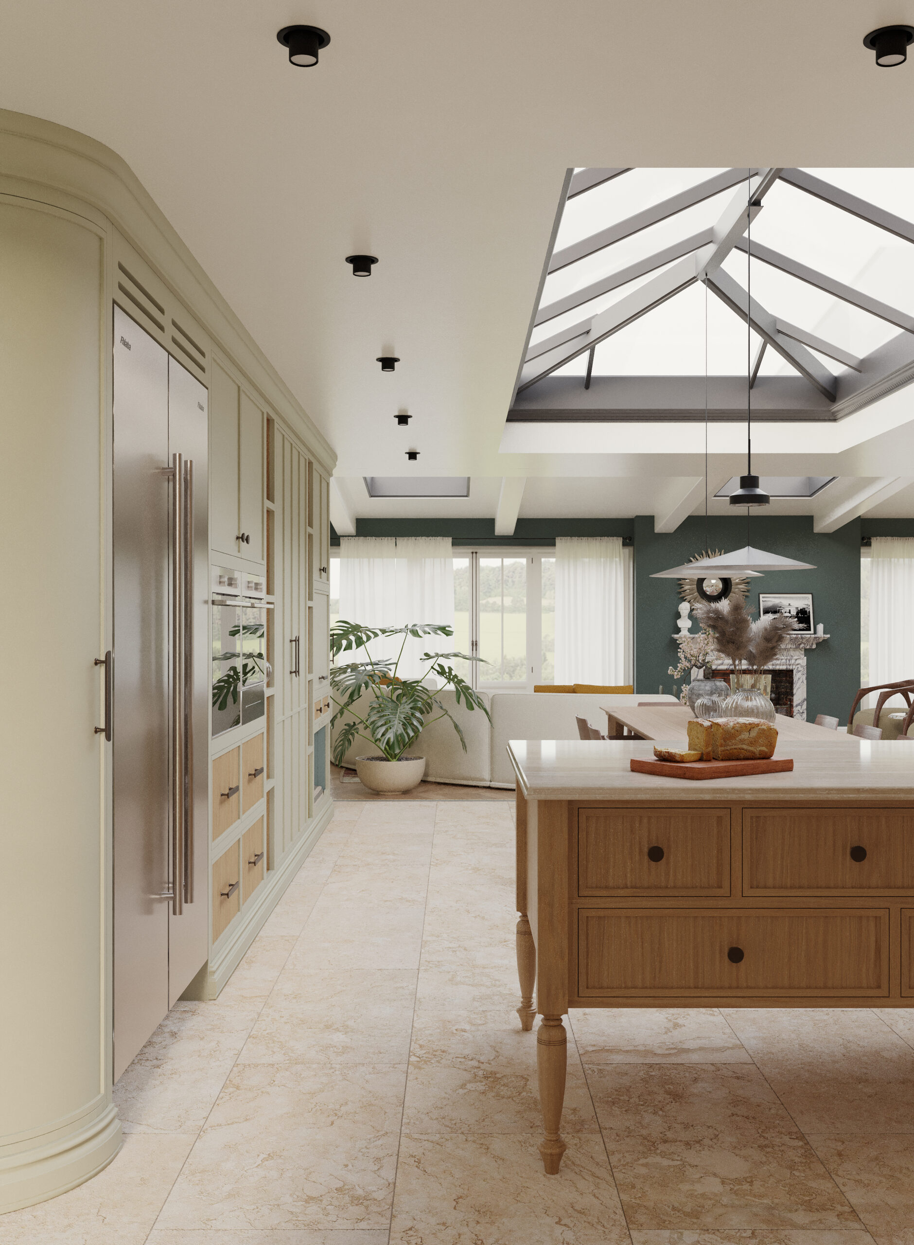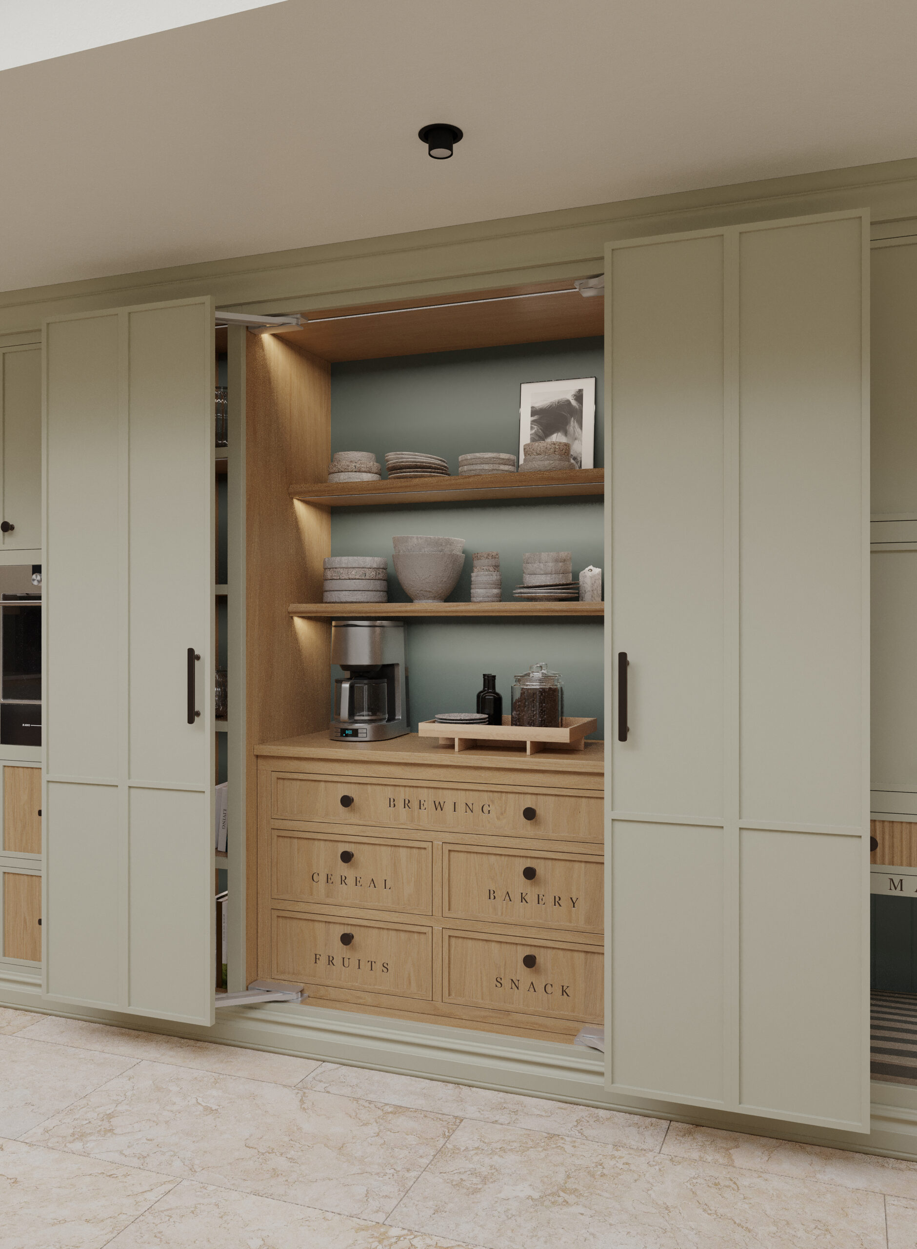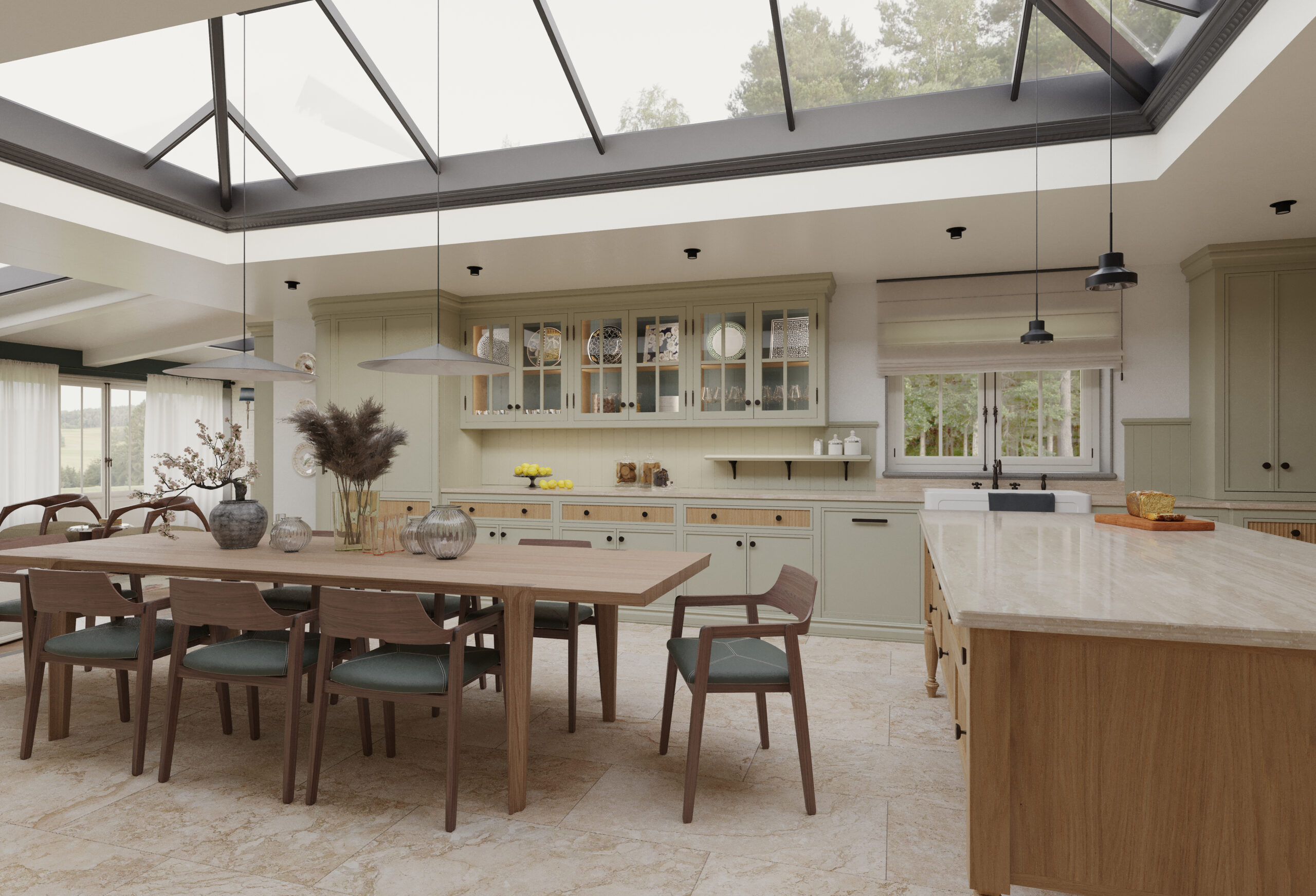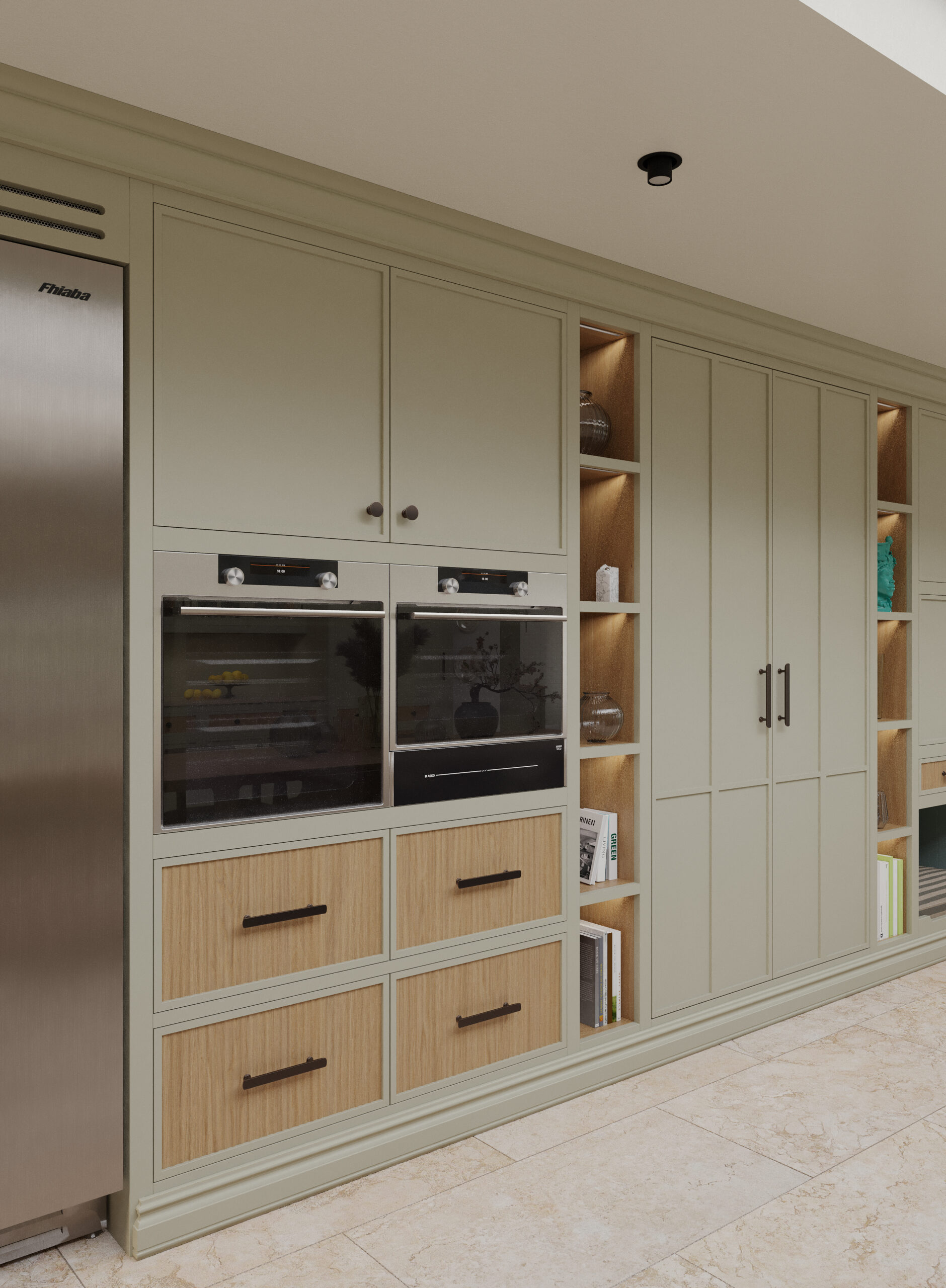 Come nella migliore tradizione inglese, lo stile d’arredo è informale, ma iconico. Un continuo rimando ai colori della terra e della natura, ai dettagli di memoria come le cerniere a vista delle vetrine e il lavello in ceramica, che si incontrano piacevolmente con quelli di design dei faretti a soffitto.