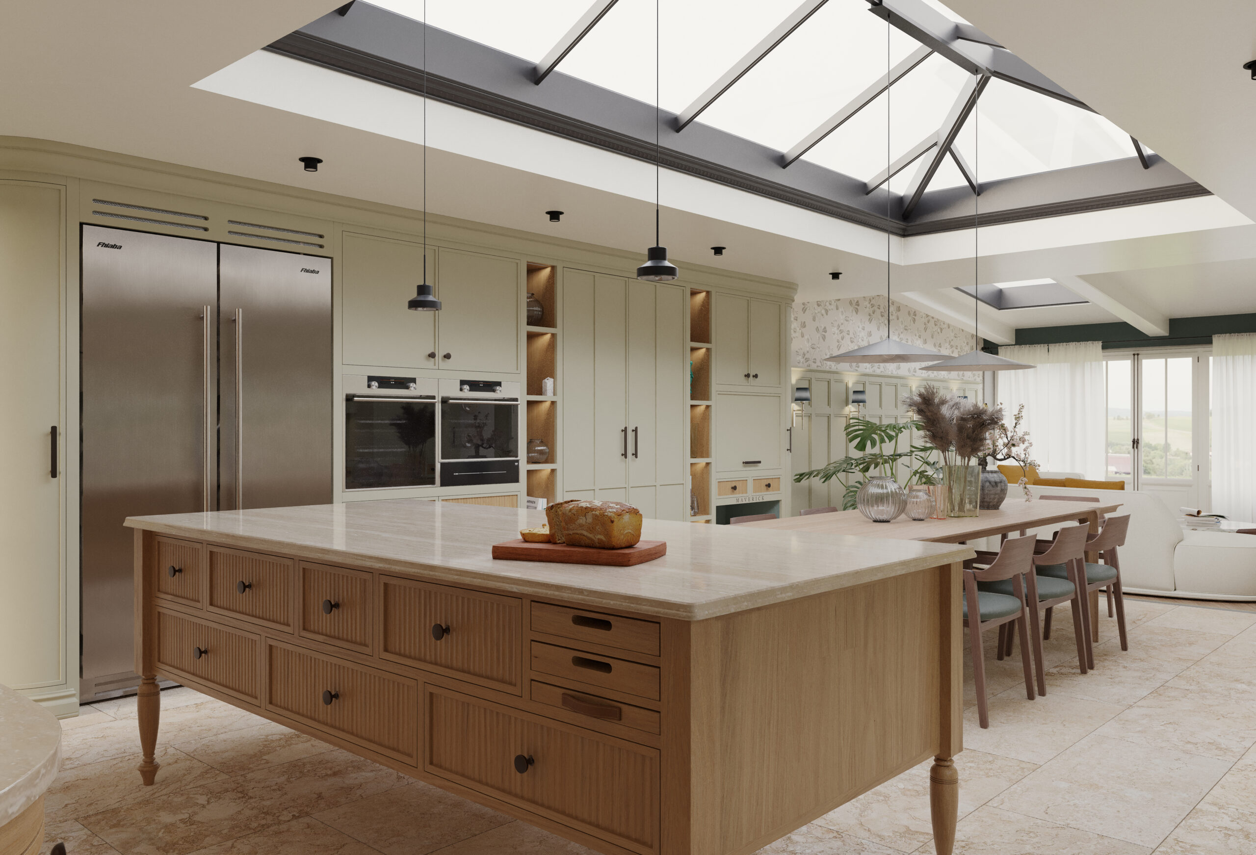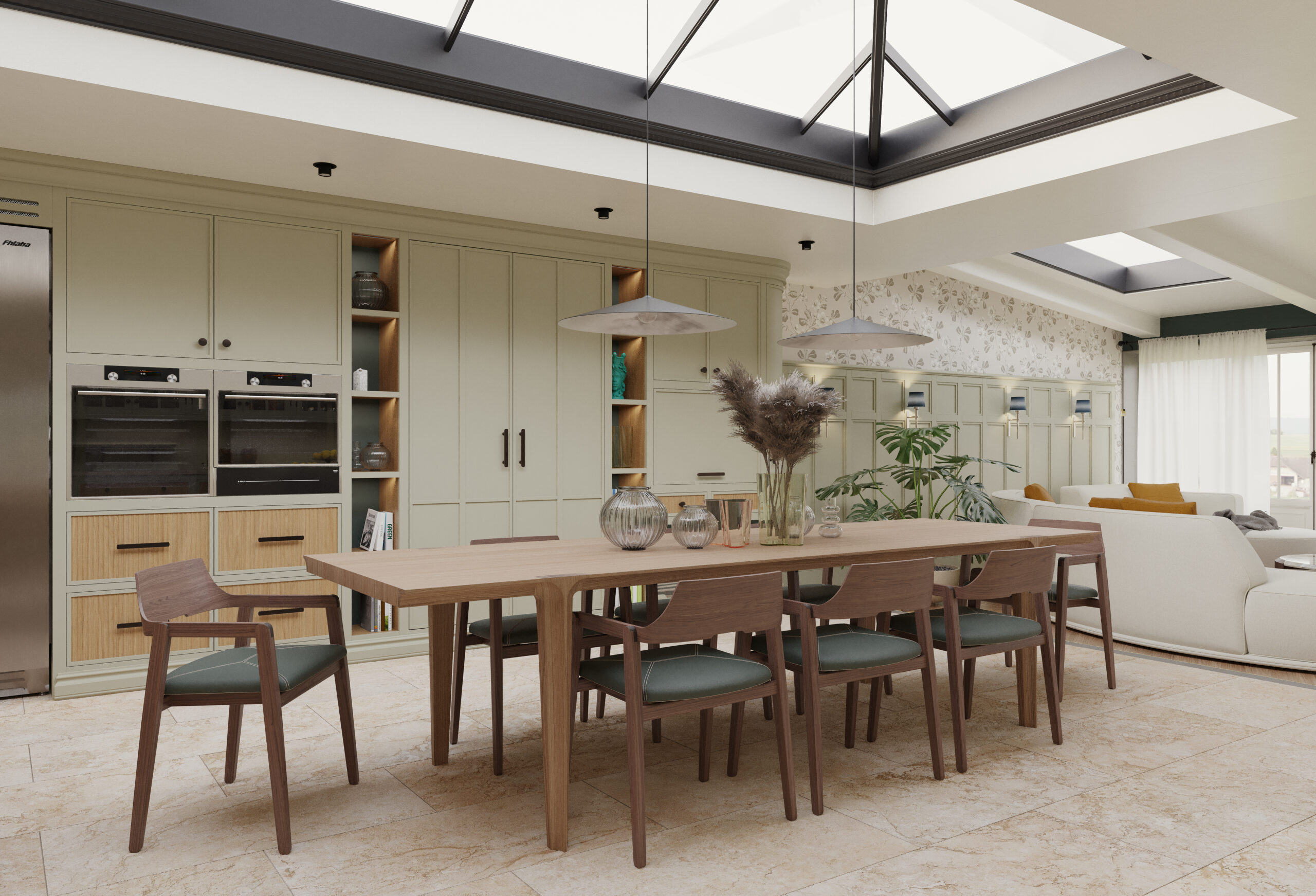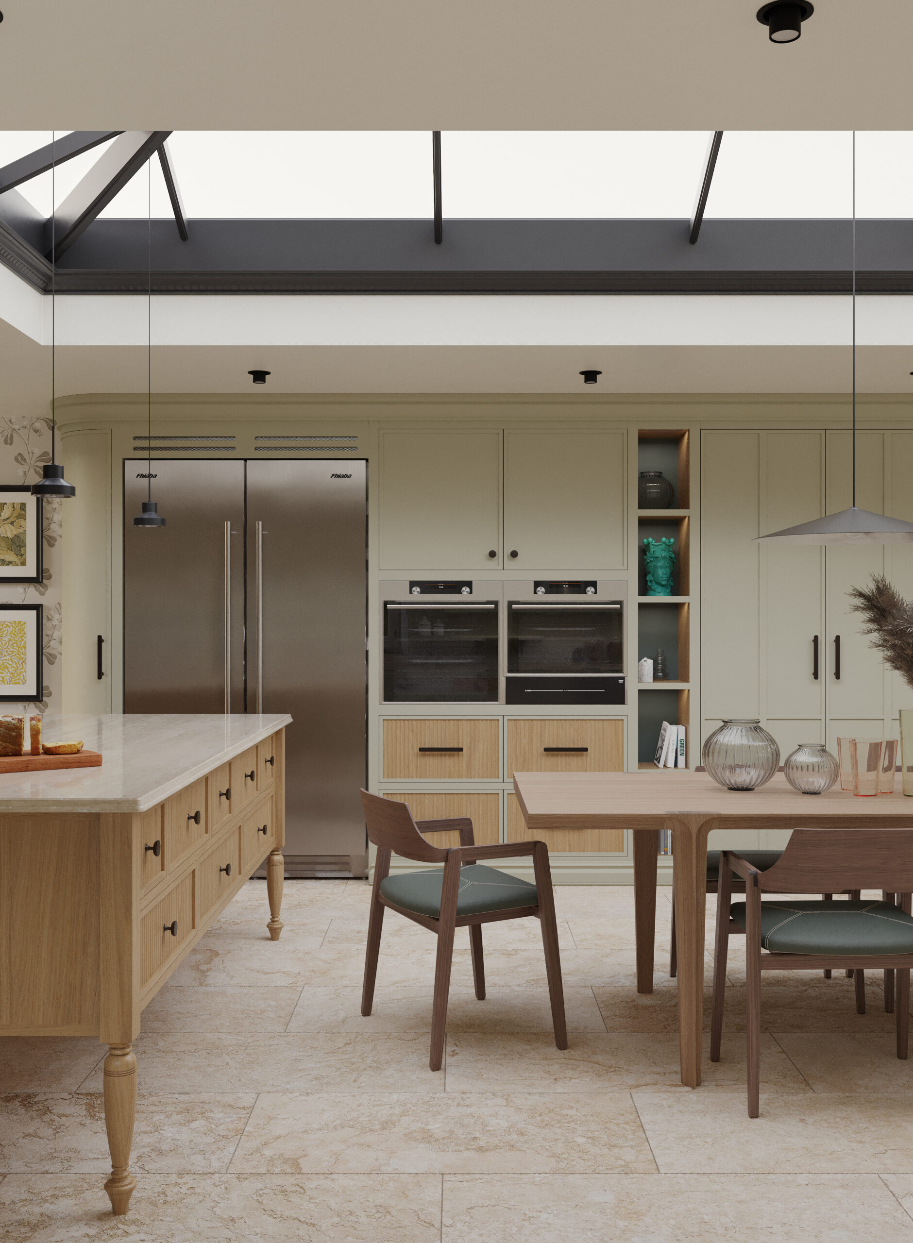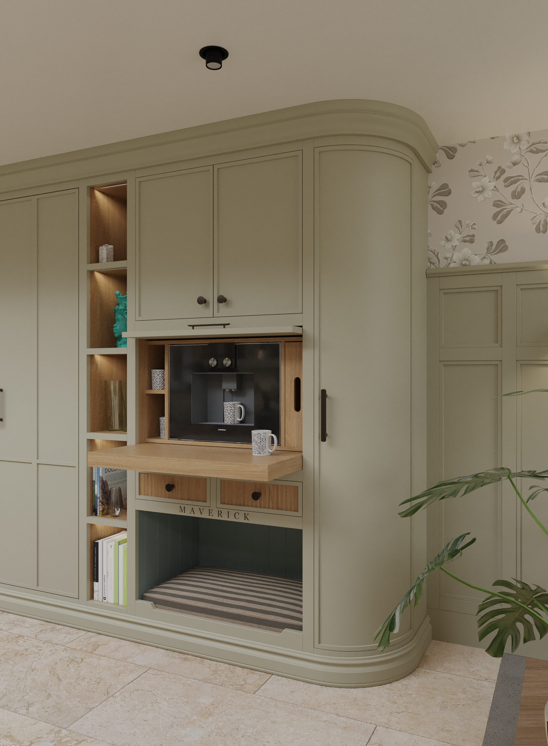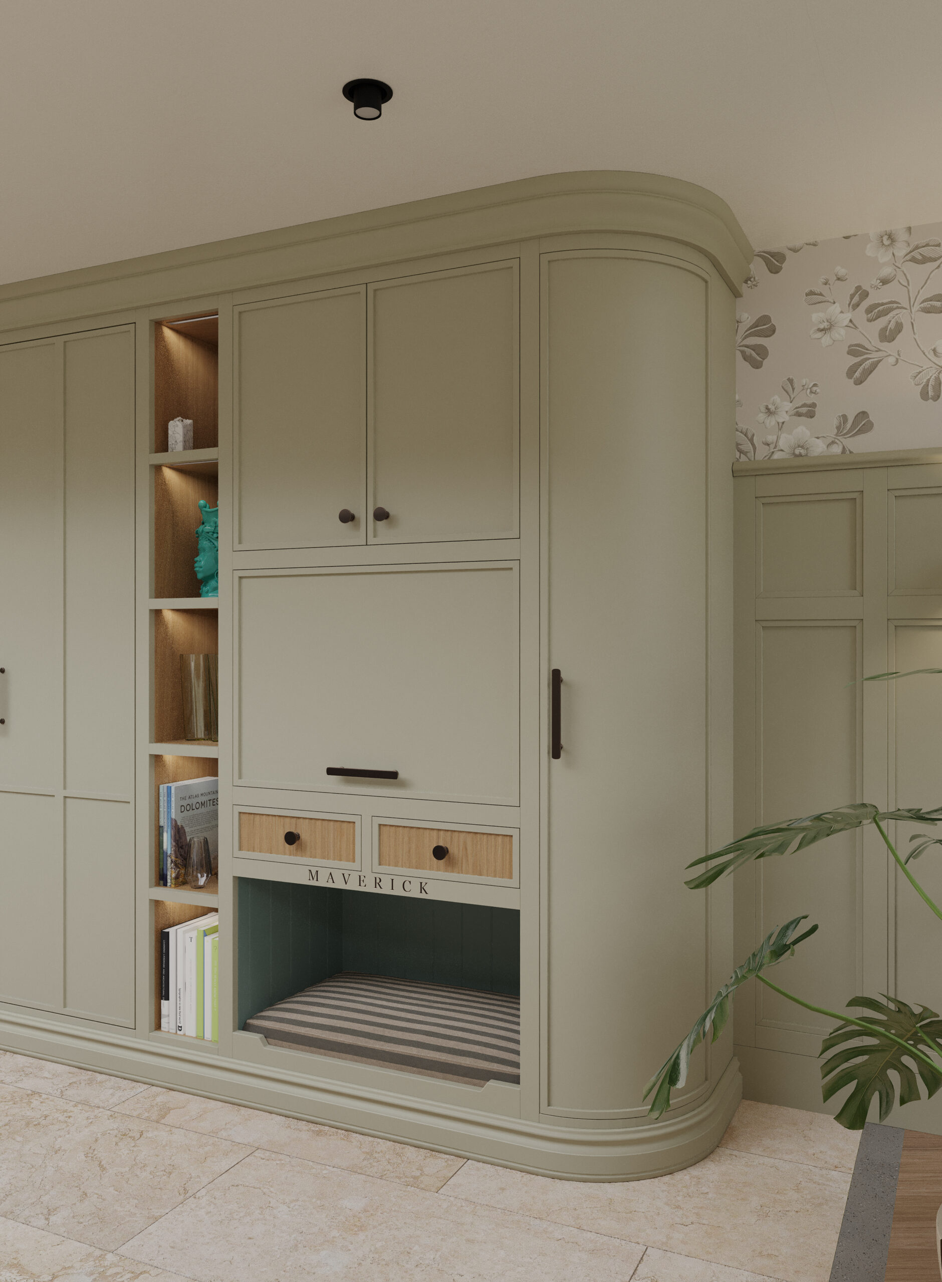 Come nella migliore tradizione inglese, lo stile d’arredo è informale, ma iconico. Un continuo rimando ai colori della terra e della natura, ai dettagli di memoria come le cerniere a vista delle vetrine e il lavello in ceramica, che si incontrano piacevolmente con quelli di design dei faretti a soffitto.